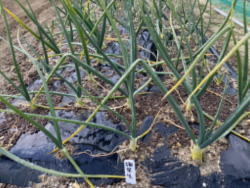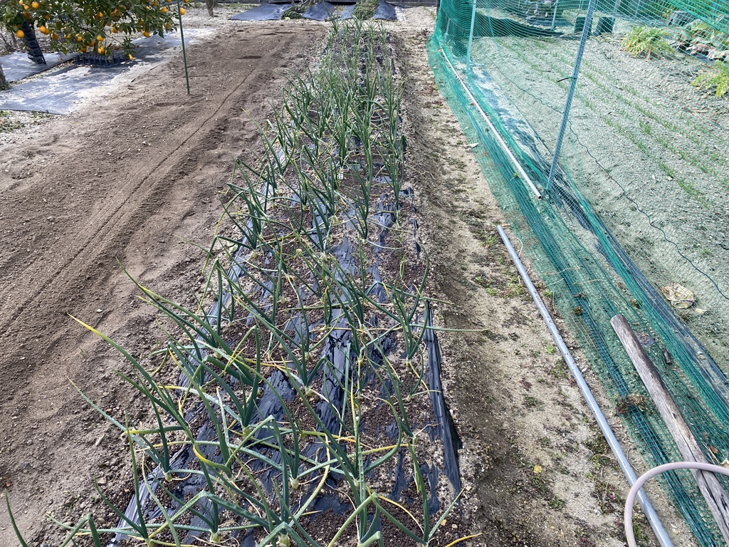 | 2025年1月5日 毎年栽培している5〜6月の初夏に収穫できる長ネギです。ビニールトンネルの中で寒さを凌いでいます。大きくしすぎるとトウ立ちしてネギ坊主できるので今のところ順調です。 タマネギは順調です。そろそろ1回目の追肥をしないといけません。雨が全然降らないので水やりもしました。 |