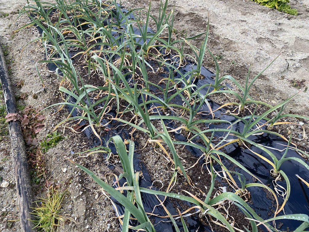 | 2024年5月27日 トウモロコシと落花生の畝を囲うように銃害対策用の網を設置しました。数年前からハクビシンと思われる動物の被害があり、この2品目は集中的にやられています。これで無事収穫までいけると思います。 スイカとメロンは子蔓が伸びてきました。4本ぐらいになるように摘芯も行いました。 ニンニクです。芽が大きくなり葉色も少し悪くなってきました。そろそろ収穫時期です。 |