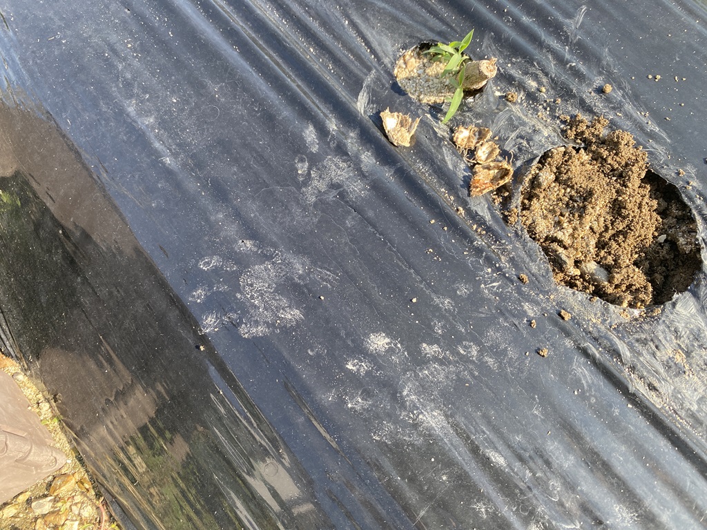 | 2024年4月22日 雨の多い日が続きますが、夏野菜を植えつけました。写真はトマト、ナス、ピーマンです。他にもスイカ、メロン、キュウリ、ズッキーニの植え付けとオクラの種まきをしました。 |
