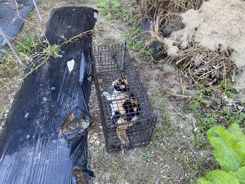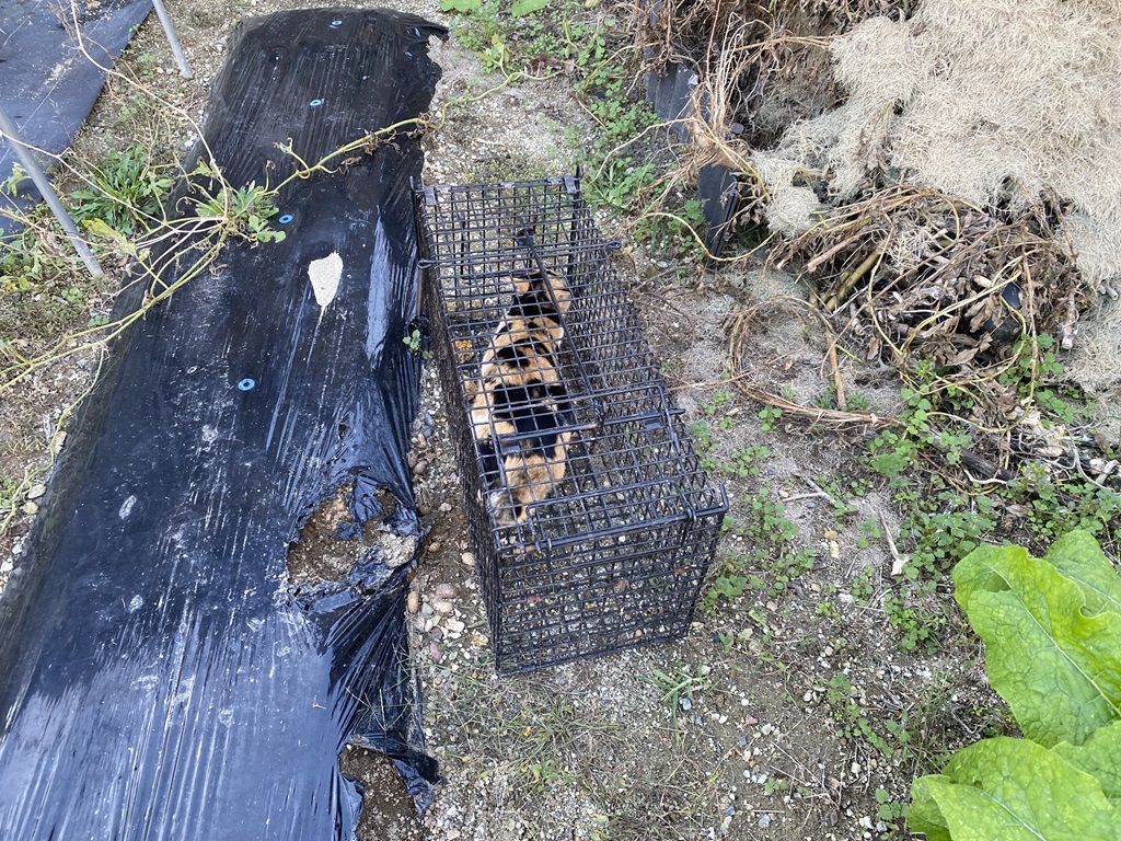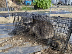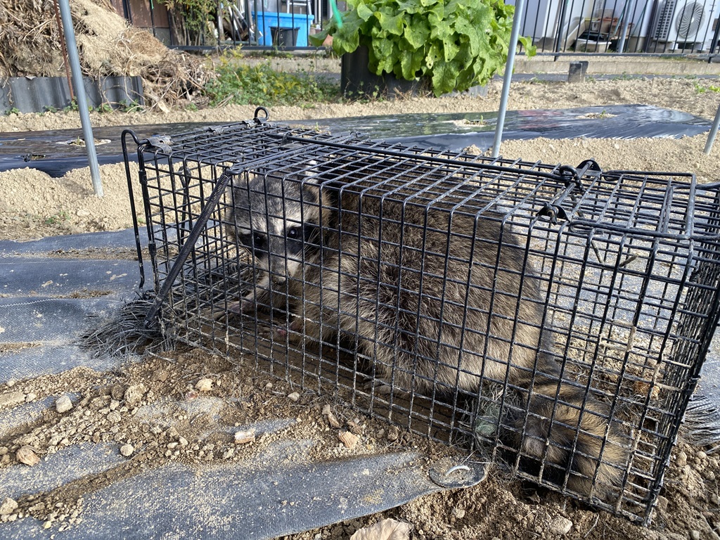 | 2025年12月5日 やりました!犯人を捕まえました。トウモロコシとスイカを全滅させ、落花生を荒らしまくった「アライグマ」です。 犯人は1匹だけでしょうか?まだいる可能性があります。継続します。 |
