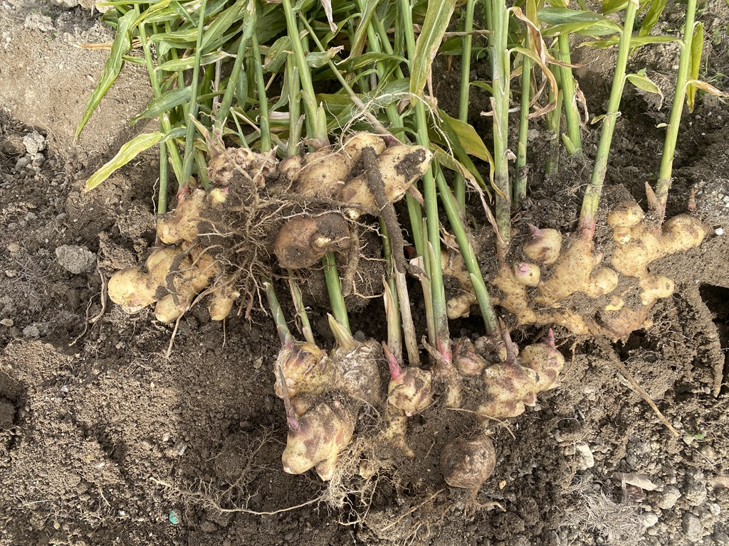 | 2025年12月13日 生姜を収穫しました。近年酷暑で失敗続きでしたが今年はまずまずの出来です。 この後、紅ショウガを作りました。 |